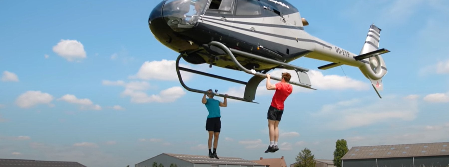 Helicopter landing skids are thicker and trickier to grip than your typical pull-up bar. They also move in the air. So some DIY was needed. After Arjen fashioned a swaying pull-up bar out of PVC pipe and rope, they had exactly what was required for practice.