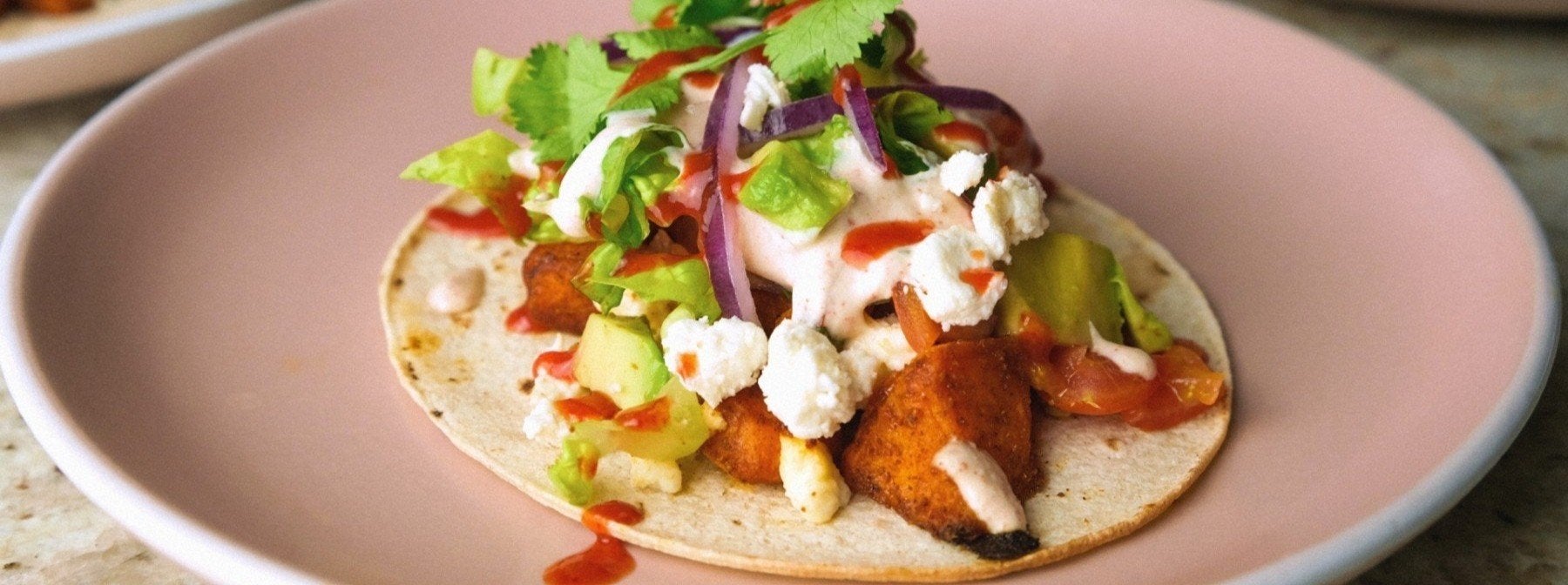 Niall Kirkland is serving up yet another incredible idea for you to get creative with in the kitchen. Loaded with baked sweet potato, crumbled feta, tangy salsa, chilli-lime soured cream, crisp shredded lettuce, and plenty of hot sauce — these soft-shell tacos are a flavour explosion to waiting to happen.
