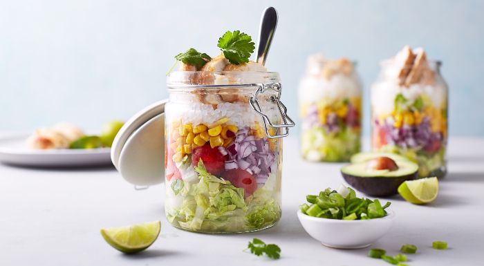 - Divide the sweetcorn amongst the jars, then add the rice, chicken, avocado, little gem lettuce leaves and lastly the cheese. Screw on the lid and enjoy 4 days’ worth of healthy lunches!