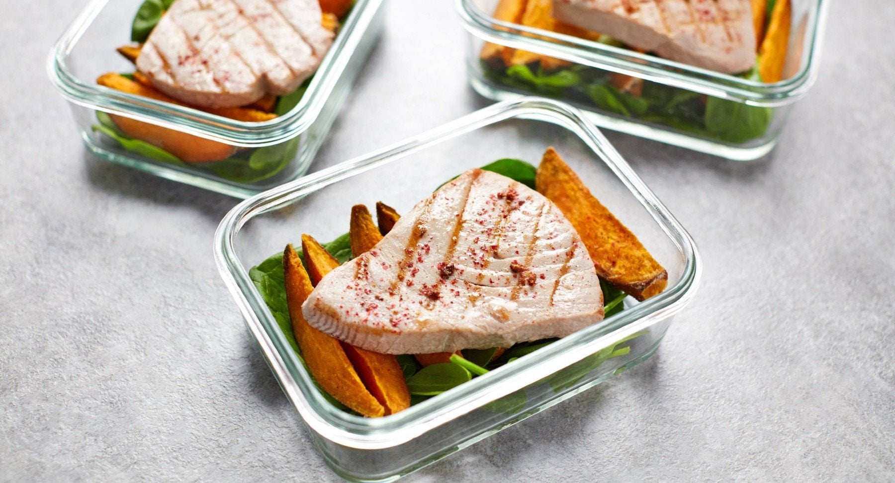 - Prepare your meal prep boxes with a bed of salad or spinach leaves, then divide up the sweet potato wedges and finally add a tuna steak. Sprinkle the steak with crushed pink peppercorns and serve with a lemon wedge.