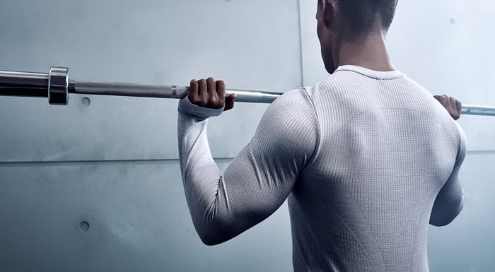 - With a medium-width grip (about shoulder width), carefully un-rack the barbell until it is held above just chest height. At this stage, your arms should be completely extended.